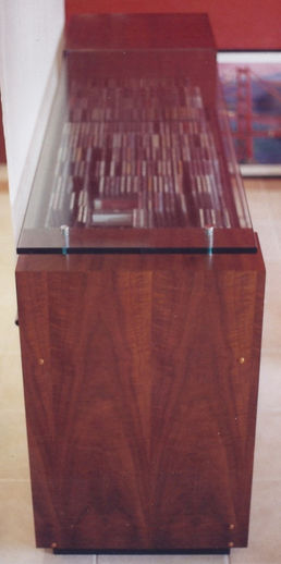 Para aumentar a capacidade de armários criamos um volume entrando na área de serviço. A parte voltada para a cozinha/espaço único é a despensa/adega. No lado área de serviço, confeccionamos grandes prateleiras triangulares com placas de cimento armado moldadas na obra, para aproveitar os cantos da passagem.