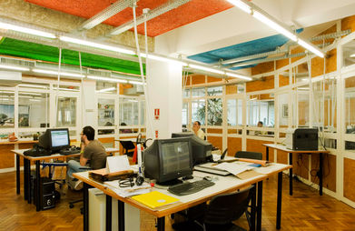 Logo, a chegada dos cabos com energia elétrica e rede informática para os postos de trabalho não podeira ser feita por baixo de piso elevado, comum em escritórios. A solução foi fazê-lo por cima com o uso de eletrocalhas. Estas levam a fiação pelas salas alimentando pontualmente as "ilhas", agrupamento de duas ou três mesas, que se espalham através o espaço aberto.